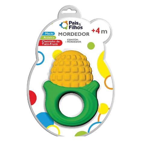 Este mordedor é feito de material macio e seguro para bebês, sem qualquer substância tóxica. Ele possui um formato de milho, com texturas diferentes que ajudam a massagear as gengivas do bebê, oferecendo alívio para os dentes em crescimento.