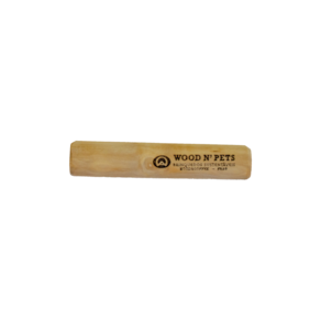 O brinquedo WOOD N PETS e´ finalizado com o´leo de coco, que ale´m de fazer bem a sau´de dos ca~es e´ um chamariz para a brincadeira.