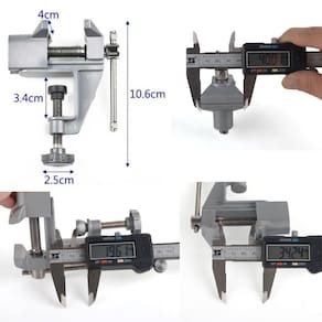 Informações Técnicas:Abertura da mandíbula: 35mm Largura da mandíbula: 40mm Altura do torno: 106mm Material: Liga de alumínio Profundidade máxima de fixação: 20mm Encaixe ajustável até 5cm Sistema de aperto: Rosca