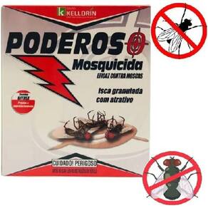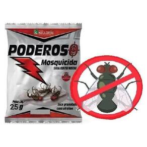 MODO DE USAR: Coloque 25g do PODEROSO MOSQUICIDA para 12,5 m² em recipientes de plástico ou papelão (ex: pratinhos descartáveis), dê uma pequena umedecida no produto e coloque-o nos locais de maior frequência das moscas. Renove a aplicação quando notar perda de eficiência.