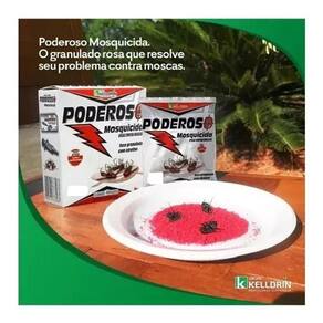 MODO DE USAR: Coloque 25g do PODEROSO MOSQUICIDA para 12,5 m² em recipientes de plástico ou papelão (ex: pratinhos descartáveis), dê uma pequena umedecida no produto e coloque-o nos locais de maior frequência das moscas. Renove a aplicação quando notar perda de eficiência.
