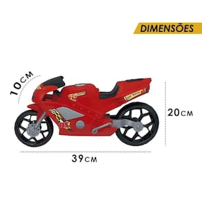 Material: Polipropileno e Adesivo Dimensões: Comprimento 39 cm x Altura 20 cm x Largura 10 cm Peso: Aproximadamente 300 g Cor: Vermelha Detalhes: Rodas esportivas, carenagem aerodinâmica, pezinho de apoio para ficar em pé Conteúdo: 01 SUPER MOTO 360 ESPORTIVA - VERMELHA Registro Inmetro: 000447/2018