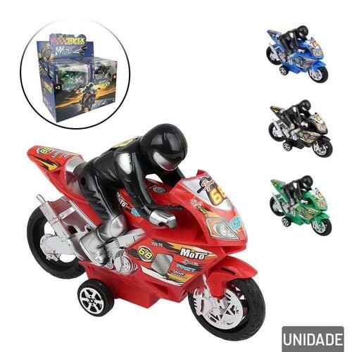 Moto de Fricção Plástico Color A Moto de Fricção Plástico Color é um brinquedo divertido com design moderno e cores vibrantes que chamam a atenção. Basta puxar para trás e soltar para ver a moto deslizar sozinha, estimulando a imaginação das crianças.\nFeita em plástico resistente, é leve, fácil de manusear e perfeita para brincadeiras criativas no dia a dia. Um item que combina diversão e movimento para animar qualquer momento.\nProduto pode ser adquirido em um Display com 12 Unidades.\nDisponível em cores.\nEspecificações:\nMarca : ARK BRASIL\nTipo de material : Plástico\nCores ou Estampa : Color\nDimensões do Produto : 13 X 17 X 5 CM\nDimensões da Embalagem : 12 X 19 X 6 CM\nPeso Bruto (Gramas) : 0.091
