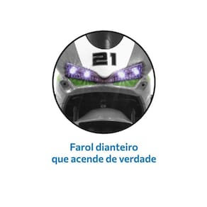 Controle Total: com o botão liga/desliga do produto, você tem controle total sobre a moto, garantindo uma pilotagem segura e conveniente.Iluminação Eficiente: equipada com farol dianteiro, oferecendo visibilidade superior durante suas viagens, podendo ligar e desligar conforme necessário.Controle de Direção: o limitador de giro do guidão garante uma pilotagem estável e segura, permitindo manobras suaves e precisas.Versatilidade de Marcha: com o botão frente/ré, você pode mover-se para frente e para trás com facilidade, proporcionando maior versatilidade durante suas aventuras.Entretenimento Integrado: curta músicas favoritas com entrada USB, conexão Bluetooth, seletor de música e indicador de bateria.Aceleração Suave: aceleração progressiva na manopla para uma pilotagem controlada e adaptada ao ritmo do piloto.Freio Confiável: freio no pedal para paradas seguras sempre que necessário.Proteção Elétrica: dispositivo de proteção do sistema elétrico para mais segurança e durabilidade.Bateria Recarregável: movida por bateria de 12V com carregador automático 127/220V incluso.
