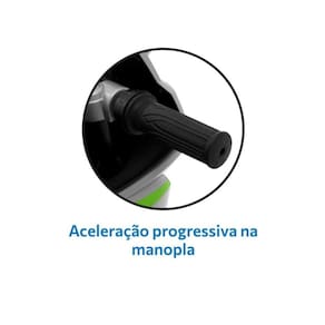 Botão liga e desliga do produtoFarol dianteiroBotão liga e desliga do farol dianteiroLimitador de giro do guidãoBotão frente/réEntrada USBConexão BluetoothSeletor de música e indicador de bateriaAceleração progressiva na manoplaFreio no pedalDispositivo de proteção do sistema elétricoMovida por bateria recarregável 12VAcompanha carregador automático 127/220V