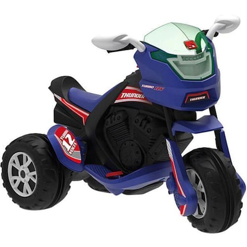 Moto Elétrica Infantil Thunder Black 12V Bandeirante com novo design e motor 12V pra turbinar a diversão da garotada Possui câmbio com duas marchas: frente e ré freio motor, manoplas em TPE atóxico, rodas grandes movida por bateria recarregável e com dispositivo de proteção do sistema elétrico. Acompanha carregador automático 127V/220V.