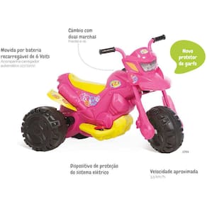 - Câmbio com duas marchas: frente e ré.- Movida por bateria recarregável 6V.- Acompanha carregador automático 127/220V.- Dispositivo de proteção do sistema elétrico.- Velocidade aproximada: 3,5 km/h. - Idade: +3 anos.- Peso máximo suportado: 3kg- Dimensões: do Produto (C,L,A) 93,5 X 60,0 X 62,5 cm "