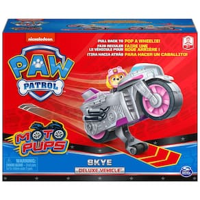 Acelere para o resgate com o exclusivo veículo Moto Pups Deluxe da Skye, da série de sucesso PAW Patrol A motocicleta apresenta gráficos autênticos, rodas grandes e uma função pullback que permite realizar cavalinhos A figura da Skye incluída está pronta para a ação, vestindo sua jaqueta de motociclista e capacete. Quando chegar a hora de uma missão em alta velocidade, prenda Skye no banco do motorista, puxe o veículo para trás e observe o partir. A motocicleta é lançada para frente, entrando em um cavalinho, correndo direto para a aventura Os veículos Moto Pups Deluxe dão vida às motocicletas PAW Patrols e podem ser colecionados para ainda mais diversão. Use os Veículos Deluxe com o Playset Moto HQ vendido separadamente para lançar e cavalinho para o resgate. Junte se a Skye em missões cheias de ação com seu veículo Moto Pups Deluxe O veículo PAW Patrol Moto Pups Skye Deluxe é o presente perfeito para crianças a partir de 3 anos e não requer baterias.