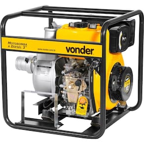 Motobomba à Diesel 3 7hp 4 Tempos Manual Água Limpa Vonder Conteúdo da embalagem 1 Motobomba a diesel, acompanha: 1 chave de fenda intercambiável (ponta fenda simples e ponta fenda cruzada 5 mm x 55 mm), 1 chave soquete 8 mm/10 mm e 2 chaves fixas 12 mm x 14 mm e 17 mm x 19 mm Aplicações e dicas de uso Indicada para remoção de Água limpa de caixas d'Água, poços, cisternas, entre outros. Também pode ser utilizada em ambientes alagados, como garagens e porões, com restrição para Água com muito barro ou excesso de areia, pedras ou pedriscos. Equipamento sem óleo, necessário abastecer antes do funcionamento. Óleo indicado 15W40. Não acompanha bateria. Destaques e diferenciais Possui excelente rendimento (vazão máxima de 55 m/h), possui sistema de partida manual retrátil com opção para partida elétrica, faltando apenas acoplar a bateria (não acompanha). Recomendamos instalar a bateria para facilitar a partida e diminuir o esforço do operador. Código da bateria 80.55.020.000. Bomba autoescorvante, ou seja, consegue fazer a sucção da Água mesmo contendo ar dentro da tubulação, permitindo eliminar a válvula de fundo de poço. DETALHES TÉCNICOS
