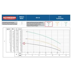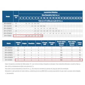 Especificações Técnicas: Modelo: BT4-1010E8 - Lateral de entrada e bocal de saída de aço inox Fase: Trifásica Voltagem: 220/380V Potência: 1 cv Estágios: 8 Diâmetro Sucção: 1 Polegada Diâmetro Recalque: 1 Polegada Pressão máxima sem vazão: 100 m.c.a Altura máxima de sucção: 3 m.c.a Rotor: 79 mm Bocais de sucção e recalque de ferro fundido GG-20 ou inox AISI-304, com rosca BSP 1. Rotor fechado de Celcon. Difusores de Noryl GFN3 - 30% de Fibra de Vidro. Selo mecânico constituído de aço inox AISI-304, buna N, grafite e cerâmica. Sistema de estágios flutuantes TRI-SEAL. Motores elétricos: IP-21, 2 Polos, 60 Hz ou IP-55, eixo de aço inox AISI-316 e isolamento classe F, 2 polos, 60 Hz. Importante: Temperatura máxima do líquido bombeado: 40C