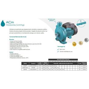 Motobomba Centrífuga Lepono ACM75 1.0hp Monofásica 220V 60Hz 7A 0,75KW. Utilizada principalmente para abastecimento doméstico e pequenos prédios. Sistemas de pressurização de baixa pressão. Irrigação de pequeno porte. Sua principal característica é o bombeamento de água com maiores vazões. Baixo custo Grande versatilidade de usos. Bomba: Corpo em ferro fundido, tratamento antiferrugem, rotor centrífugo fechado em noryl, ponta de eixo em aço inox AISI 304, temperatura máxima do líquido 60C, sucção máxima 8 mca, selo mecânico em grafite cerâmica buna. Motor: Protetor térmico, classe de isolação F, classe de proteção IPX4, temperatura ambiente máxima 40C. Cor: Verde e Preto. Medidas aproximada do produto: 24x19x30 cm AxLxC . A embalagem contém 1 unidade. Imagens meramente ilustrativas. As cores podem sofrer alterações devido a luminosidade, configurações do monitor e percepção do usuário.