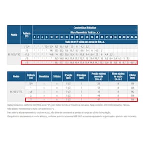 Especificações Técnicas: Proteção do motor: IP-21 Frequência motor: 60Hz Potência motor: 3 CV Tensão: 127/220 Volts Fase: Monofásica Diâmetro Rotor: 158mm Diâmetro Sucção: 1x1/2 Polegada Diâmetro recalque: 1 Polegada Linha S: motobomba sem intermediário Modelo: Monoestágio Selo Mecânico: Aço inox AISI-304, buna N, grafite e cerâmica Temperatura máxima do líquido bombeado: 70C