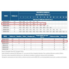 Especificações Técnicas: Potência: 1/2 cv Tensão:380 Volts Fase: Trifásica Diâmetro Recalque: 2 Polegada Diâmetro máximo dos sólidos: 8 mm Pressão máxima sem vazão: 16 mca Diâmetro Rotor: 98 mm Bocal roscado BSP Caracol da motobomba de ferro fundido cinzento GG-20 Rotor semiaberto Vórtex de Noryl 30% fibra de vidro para os modelos DV / EV até 1 cv Placa de fundo de ferro fundido GG-20 com borracha Neoprene para o modelo D Selo mecânico constituído de aço inox AISI-304, buna N, hard carbon e cerâmica para os modelos DV / EV até 1 cv Selo mecânico duplo, constituído de aço inox AISI-304, buna N, grafite e cerâmica para os modelos D / E / EV40 Motor elétrico IP-68, 2 polos, 60Hz, refrigerado com óleo dielétrico, eixo de aço inox AISI-420 As motobombas monofásicas possuem opção com boia elétrica para acionamento automático (modelos DV / EV) Motor monofásico com proteção térmica (modelos DV / E / EV) Comprimento do cabo de ligação: 7 m (modelos DV / EV) e 10 m (modelos D / E / EV40)