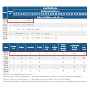 Especificações Técnicas: Modelo: ME-IN 1315N Potência: 1,5 CV Tensão:110/127/220/254 Volts Fase: Monofásica Número de estagios: 3 Diâmetro Sucção: 1 Polegada Diâmetro Recalque: 1 Polegada Pressão máxima sem vazão: 63 mca Altura máxima de sucção: 8 mca Diâmetro Rotor: 110 mm Bocais com rosca BSP Rotor fechado de aço inox AISI-304 Anel flutuante de aço inox AISI-304 Eixo de aço inox VC150 Selo mecânico constituído de aço inox AISI-304, EPDM, grafite e cerâmica Lateral de entrada, divisão, corpo de saída, acoplamento e intermediário de ferro fundido Motor elétrico IP-21, 2 polos, 60 Hz