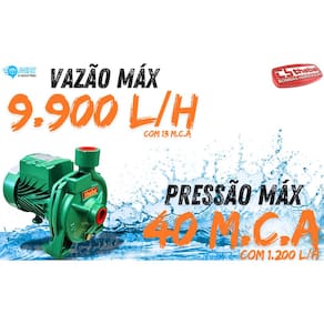 . Grau de proteção: IP44 . Fornecedor Motor: THEBE . Número de Fase: MONOFÁSICO . Voltagem: 127/220V ( Não e Bivolt ) . Potência: 2,0 cv . Rotor: 150mm . Pressão Máxima: 40 MCA - Pressão Mínima 13 MCA . Vazão Máxima: 9,900 L/H, Vazão Mínima 1,200 L/H . Ambiente: ABRIGADO . Material selo mecânico CERÂMICA/GRAFITE/BUNA-N