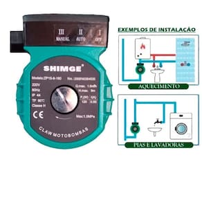 Motobomba de circulação e pressurização 27 l/min shimge zp15-9-160 220v Utilidades e instalação: A motobomba da série zp15-9-160 premium é utilizada para pressurização de chuveiros e torneiras água limpa . Ideal para sistema de água quente pressurizada isenta de sólidos . Compacta, de fácil instalação e com chave seletora para modo manual/automático. Características construtivas: Corpo da bomba em ferro fundido Tratamento antiferrugem Rotor centrífugo em noryl Enrolamento em cobre Classe de isolação: h Grau de proteção: ip44 Conexão: 3/4 rosca bsp sucção e recalque Potencia 125w Tensão 220v Desempenho: Vazão de até 27l/min 1,6m/h Altura manométrica total de até: 9 m.C.A Limites de uso Ph do líquido: 6-8 Temperatura ambiente: máx. +40c Temperatura do líquido: máx. +90c 2 anos Imagens meramente ilustrativas Marca: Não Informado