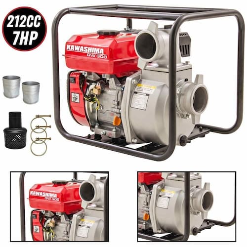 Motobomba Kawashima GW300 é equipada com motor à gasolina 4 tempos de 212cc, possui diâmetros de sucção/saída de 3" ;(76mm), com altura de de 26m e vazão maxima de 60m/h, com partida manual. ;A Motobomba é portátil, econômica e fácil de operar. Indicada para o uso agrícola e urbano, ideal para a transferência de água limpa. Pode ser usada no abastecimento de caixas de água, cisternas e irrigação.