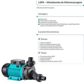 Motobomba Hidromassagem 1/2cv 220V Lepono Motobomba Hidromassagem LSPA 600 1/2cv 220V PDR Lepono Utilizada para banheiras de hidromassagem.Vantagens-Baixo custo-Alta perfomance hidráulica-Acompanha conexões rápidas-Possui sucção deslocada para baixo (impede que a água fique parada quando a motobomba estiver desligada) Características técnicas-Bomba-Corpo em plástico-Rotor centrífugo fechado em noryl-Ponta de eixo em aço inox AISI 304-Temperatura máxima do líquido: 50ºC-Selo mecânico em grafite cerâmica buna Motor-Classe de proteção: IPX5-Classe de isolação: F-Protetor térmico -Temperatura ambiente máxima: 40ºC