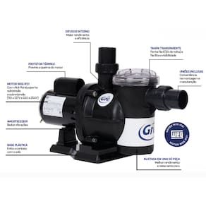* Motor WEG de 1/2 CV: Potência ideal para movimentar grandes volumes de água, garantindo uma filtragem eficiente e rápida da sua piscina.