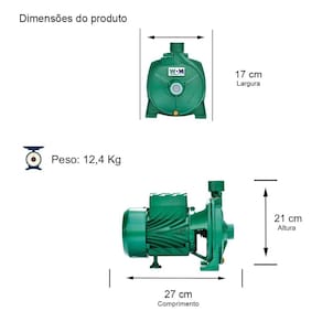 Motobomba Centrífuga Monoestágio - Motor Monofásico , 60Hz, 3500rpm - Bocais com rosca BSP, Sucção 1" x Recalque 1". - Eixo ponta em inox - Utilizada para água limpa até temperatura de 40ºC - Rotor fechado em Bronze. - Anel O'ring de vedação da carcaça em Buna N. - Selo mecânico: Faces em grafite e cerâmica. Mola em inox 304 e elastômero (borracha) em Buna N.