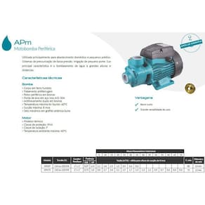 Motobomba Periférica Lepono APm75 1.0hp 220V Monofásica. Utilizada principalmente para abastecimento doméstico e pequenos prédios. Sistemas de pressurização de baixa pressão. Irrigação de pequeno porte. Sua principal característica é o bombeamento de água à grandes alturas e distâncias. Referência: 50000407100 VANTAGENS: Baixo custo, Grande versatilidade de usos. CARACTERÍSTICAS TÉCNICAS Bomba: Corpo em ferro fundido, Tratamento antiferrugem, Rotor periférico em bronze, Ponta de eixo em aço inox AISI 304 Antitravamento duplo em bronze, Temperatura máxima do líquido: 60C, Sucção máxima: 8 mca, Selo mecânico em grafite cerâmica buna Motor: Protetor térmico, Classe de proteção: IPX4, Classe de isolação: F, Temperatura ambiente máxima: 40C. Modelo do Selo Mecânico: Grafite Cerâmica Buna. Marca: Lepono. Conteúdo da embalagem: 1 Motobomba. Dimensões aproximadas do produto: 19,0 x 14,0 x 30,0 cm (A x L x C). Dimensões aproximadas da embalagem: 22,0 x 19,0 x 34,0 cm (A x L x C). Peso aproximado do produto: 5 Kg. Peso aproximado da embalagem: 5,5 Kg. Informações Adicionais: Maior qualidade e durabilidade no dia a dia. Produtos de decoração não inclusos. Imagens meramente ilustrativas. As cores dos objetos podem sofrer alterações devido a luminosidade, configurações do monitor e até mesmo a percepção do usuário.