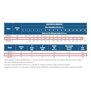 Especificações Técnicas: Modelo: SP-15C - Motor Monofásico com Proteção Térmica e Capacitor Permanente Tipo: Pressorizadora Fase: Monofásica com Capacitor Voltagem: 220V Potência: 3/4CV Diâmetro Sucção: 1 Polegada Diâmetro Recalque: 1 Polegada Pressão liga : 15 m.c.a Altura máxima de sucção: 3 m.c.a Rotor: 128 mm Rotor em Noryl - (Composiçao Polímero + 30% de vibra de vidro) Modelos SP-15 C: motor IP-00 com capa de proteção, proteção térmica e capacitor permanente, 2 polos, 60 Hz Controlador eletrônico de pressão IP-65, corrente máxima 10 A, pressão máxima de trabalho 100 m.c.a., entrada e saída: 1 x 1 Equipamento com válvula de retenção incorporada