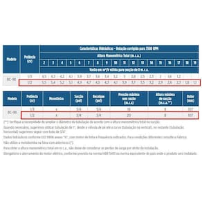 Especificações Técnicas: Bocais com rosca BSP Caracol da motobomba de ferro fundido GG-20 Rotor fechado de Noryl, com 30 % de fibra de vidro (maior resistência) Selo mecânico constituído de aço inox AISI-304, buna N, grafite e cerâmica Motor elétrico IP-21 com flange incorporada, termostato e capacitor permanente, 2 polos, 60 Hz Potência: 1/2cv Tensão: 220 Volts Fase: Monofásica Diametro Sucção: 3/4" Diametro Recanque: 3/4"