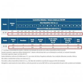 Especificações Técnicas: Bocais com rosca BSP Caracol da motobomba de ferro fundido GG-20 Rotor fechado de Noryl, com 30 % de fibra de vidro (maior resistência) Selo mecânico constituído de aço inox AISI-304, buna N, grafite e cerâmica Motor elétrico IP-21 com flange incorporada, termostato e capacitor permanente, 2 polos, 60 Hz Potência: 1/2cv Tensão: 220 Volts Fase: Monofásica Diametro Sucção: 3/4 Diametro Recanque: 3/4