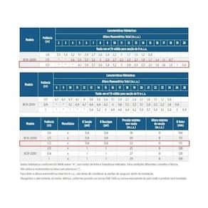 Especificações Técnicas: Caracol da motobomba de ferro fundido GG-15 Rotor fechado de alumínio (BCR-2000) Rotor fechado de Noryl, com 30% de fibra de vidro - maior resistência - e inserto metálico (BCR-2010) Selo mecânico constituído de aço inox AISI-304, buna N, grafite e cerâmica Motor elétrico IP-00 com capa de proteção, proteção térmica e capacitor permanente, 2 polos, 60 Hz Potência: 1/2 cv Fase: Monofásica Tensão : 220 V Sução/Recalque: 3/4 Importante: Temperatura máxima do líquido bombeado: 55 C. Tipo de bomba centrífuga: Centrífuga Altura máxima de sucção: 8 m Grau de proteção do motor: IP00 Temperatura máxima de entrada de água: 55 C Diâmetro de entrada: 0.75 Diâmetro de saída: 0.75