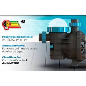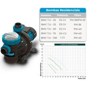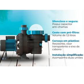 Esta motobomba acompanha 2 uniões para encaixe no tubo de 50 mm; Ela tem sua ligação elétrica monofásica 220 volts qualquer duvida consulte-nos no campo de perguntas Compativel com filtro da sodramar : fm60 para outros filtros consulte-nos no campo de perguntas A sodramar oferece o que há de mais avançado em tecnologia de motobombas, purificando a água e priorizando a qualidade do lazer e a saúde dos usuários. As motobombas residenciais sodramar, são constituídas de material resistente e a prova de corrosão, possuem alta vazão, atuando com eficiência e segurança; além de serem auto-escorvantes, permitindo que trabalhem acima do nível da água. Os modelos variam de 1/4 à 1cv e sem dúvidas, este produto atenderá sua necessidade de forma satisfatória. A bomba bmc-100 t.U está disponível com ligação monofásica 220v . Informações gerais: Comprimento = 52 cm Largura = 24 cm Altura = 35 cm Pressão mca x m/h = 4 mca = 19,8 m/h 6 mca = 18,4,75 m/h 8 mca = 15,7 m/h 10 mca = 12,5 m/h 12 mca = 9,5 m/h 14 mca = 6,4 m/h Motobomba segue com pré filtro e cesto coletor; Produto possui de 12 meses direto com a fábrica a sodramar possui assitência técnica em todo território nacional Marca: Não Informado