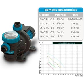 Esta motobomba acompanha 2 uniões para encaixe no tubo de 50 mm; Ela tem sua ligação elétrica monofásica 220 volts qualquer duvida consulte-nos no campo de perguntas Compativel com filtro da sodramar : fm36 para outros filtros consulte-nos no campo de perguntas A sodramar oferece o que há de mais avançado em tecnologia de motobombas, purificando a água e priorizando a qualidade do lazer e a saúde dos usuários. As motobombas residenciais sodramar, são constituídas de material resistente e a prova de corrosão, possuem alta vazão, atuando com eficiência e segurança; além de serem auto-escorvantes, permitindo que trabalhem acima do nível da água. Os modelos variam de 1/4 à 1,0cv e sem dúvidas, este produto atenderá sua necessidade de forma satisfatória. A bomba bmc-33 t.U está disponível com ligação monofásica 220v . Informações gerais: Comprimento = 52 cm Largura = 24 cm Altura = 35 cm Pressão mca x m/h = 4 mca = 11,9 m/h 6 mca = 8,8 m/h 8 mca = 6,0 m/h Motobomba segue com pré filtro e cesto coletor; Produto possui de 12 meses direto com a fábrica a sodramar possui assitência técnica em todo território nacional Marca: Não Informado