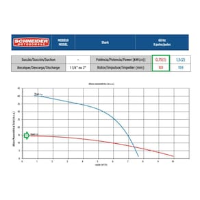 Especificações Técnicas: Modelo: Shark Tipo: Trituradora / Submersa Monoestágio Potência: 1 CV Tensão: 220 Volts Fase: Monofásica Diâmetro Recalque: Bocais com rosca BSP 1 1/4 e adaptador com rosca 2 Polegadas Diâmetro Rotor: 101 mm Pressão máxima sem vazão: 14,5 m.c.a. Rotor semiaberto Material do rotor: Ferro Fundido GG-25 Selo mecânico em Buna Eixo em aço inox 420 Triturador de aço inox temperado AISI 440 C, de alta dureza; Selo mecânico constituído de aço inox AISI-316, buna N, carbeto de silício (Modelos 1 cv) Motor elétrico IP-68, 2 polos, 60 Hz, refrigerado com óleo dielétrico, classe de isolamento F (155 Motor monofásico com proteção térmica Comprimento do cabo de ligação: 6 m (Modelos 1 cv)