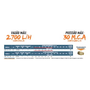 - Potência: 1.0 cv - Voltagem: 127/220 V - Grau de proteção: IP44 - Vazão Máxima: 3.2 m³/h - Pressão Máxima: 46.0 mca - Material do rotor: TERMOPLÁSTICO - Ambiente: DESABRIGADO - Fornecedor Motor: WDM - Número de Fase: MONOFÁSICO