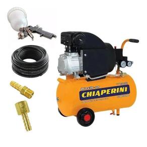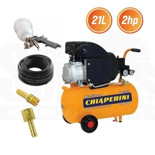 Distribuído por Casa das SerrasCaracterísticas- Com o seu Chiaperini MC 7.6/21, as tarefas manuais que exigem pressão de ar serão muito mais simples. Economize tempo e obtenha excelentes resultados sem esforço.- Para trabalhos domésticosSua potência de 2hp torna a ferramenta necessária para tarefas domésticas que exigem um baixo nível de pressão. Além disso, a capacidade do tanque 21l permite usos pontuais e por um curto período de tempo, permitindo que você recarregue rapidamente para reutilizá-lo sempre que quiser.Especificações- Deslocamento Teórico: 216 l/min – 7,6 pcm- Pressão máxima: 116 psi – 8 bar- Reservatório: 21L- Nº de Cilindros: 1- Nº de Estágios: 1- RPM do Bloco: 3400- Motor Elétrico: 2hp – 1,5kW – 2P- Óleo Lubrificante Volume: 250ml- Peso do Cabeçote: 12,5 kg- Tensão: 127V+- MANGUEIRA BORRACHA 5/16" PRETA - PNEUMATICA - 10 METROSCód.: 353050010+- PINO ESPIGAO FIXO FEMEA 1/4 X 5/16 LUB-24J LUBEFER - 1 UNIDADE- PINO ESPIGAO FIXO MACHO 1/4 X 5/16 LUB-24B LUBEFER - 1 UNIDADE+- Pistola De Pintura Hvlp Prof 5457 Titanium + 3 Bicos + KitCARACTERÍSTICAS:- Pistola de pintura com gravidade e ótima performance, fabricada em material resistente proporcionando durabilidade e eficiência em qualquer pintura.ESPECIFICAÇÕES:- Marca: TITANIUM- Ref.: TITANIUM-5457- Acompanha: 3 Bicos: 1,2mm, 1,5mm e 1,8mm- Caneca: 600ml- Escova para limpeza- Garantia: 6 meses- Alimentação Pneumática- Pressão de trabalho 2.75 bar- Diâmetro do bico 1.2 1.5 E 1.8IMAGENS MERAMENTE ILUSTRATIVAS
