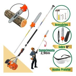 01 Motor, 01 haste com eixo cardã completa, 01 extensor com eixo, 01 sabre, 01 dosador de combustível, 04 parafusos, 01 corrente Oregon, protetor de sabre, 01 cinto de sustentação, 01 jogo de chave (1 chave de boca, 1 chave combinada, 1 chave fenda) e manual do usuário.EXTRAS: Acompanha 1 Oculos de Proteção Profissional Incolor Ergonomico com Regulagem de Profundidade, Anti Risco e Anti Embaçante.