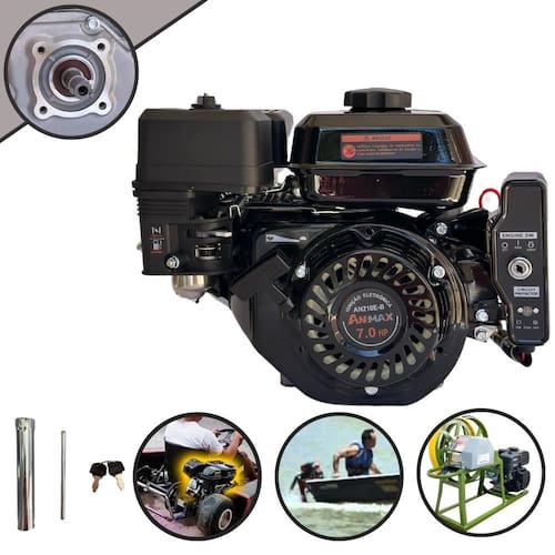 Os motores estacionários ANMAX são equipamentos robustos que proporcionam grande economia e alto desempenho. Podem ser acoplados em diversos equipamentos como microtratores, motobombas, geradores, rabeta para barcos, moenda de cana e outros equipamentos. Produto de alta qualidade, estrutura compacta, design leve, fácil de usar e durável. Possui motor de 7HP e 208cc à gasolina, com sistema de partida manual e partida elétrica.