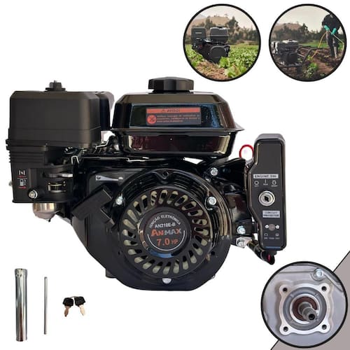 Os motores estacionários ANMAX são equipamentos robustos que proporcionam grande economia e alto desempenho. Podem ser acoplados em diversos equipamentos como microtratores, motobombas, geradores, rabeta para barcos, moenda de cana e outros equipamentos. Produto de alta qualidade, estrutura compacta, design leve, fácil de usar e durável. Possui motor de 7HP e 208cc à gasolina, com sistema de partida manual e partida elétrica.