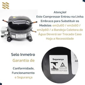O grupo náutica refrigeração possui mais de 25 anos de experiência no ramo da refrigeração, fornecendo produtos e atendimento de qualidade, contamos com uma equipe de profissionais completa para te ajudar---------------------------------------------------------/ /----------------------------------------------------------O compressor é o coração de um sistema de refrigeração. Sua função é bombear o fluido refrigerante que circula por todo o sistema ora no estado líquido, ora no estado gasoso.Por que você deveria comprar o compressor embraco emi60herCompacto e funcional, o compressor emi60her da embraco, funciona de maneira a diminuir ruídos e trepidações no sistema de refrigeração. Esse item é designado para trabalhar com o gás r134a e possui baixa temperatura de evaporação, o que o torna ideal para aplicação em freezers e refrigeradores.Especificações técnicasVoltagem: 127v;Potência: 1/6 hp;Peso: 7,68kg;Fluido refrigerante: 134a;Torque: lst - baixo torque de partida;Carga de óleo: 160ml;Tipo de tecnologia: on/off;Temperatura de evaporação: -35c to -10c;Modelos atendidos: brd32b, brd33a, bro31a, bro35a, bvg24d, bvg24fb, bvg24gb, bvs26b, cha22c, crd33a, crd33b, crd34b, crd35db, crd35dc, crd36fb, crd36fc, crd36gb, crd37eb, crd37zb, cvu18eb, cvu18fb, cvu26b, cvu26c, cvu26db, cvu26dc.Itens inclusos:01 protetor térmico01 relé01 tampa do protetor térmicoDúvidas frequentes:O produto contém garantiaGarantia de 90 dias vigente apenas para defeito de fabricação, conforme o código de defesa do consumidor. Esta garantia será invalidada se a placa apresentar sinais de queimado, sinais de queda/quebra, umidade ou qualquer dano físico.O produto é novoSim, todos os nossos produtos são novos.Obs: nós não efetuamos posteriores alterações de dadosO cadastro é de responsabilidade do cliente com acesso restrito.Despacho e entregas:Cancelamentos, devoluções e reembolsos:Cancelamentos de pedidos já despachados ou reembolso de pagamentos, devem respeitar os prazos estabelecidos pela plataforma de compra, não temos como interferir nestes prazos.O reembolso em qualquer situação será sempre feito via plataforma de pagamento. Agradecemos sua preferência, sinta-se livre para tirar suas dúvidas no campo de perguntas, responderemos o mais rápido possível