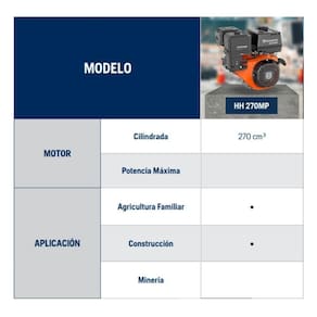 Especificações Técnicas: Modelo: HH 270MP Deslocamento do cilindro: 16,5 polegada cúbica Deslocamento do cilindro: 270 cm Potência máxima: 9,0 Potência nominal: 8,0 Potência: 9 cv Potência: 6,6 kW Potência considerando o rpm no estágio presente Energy: 6 kW Volume do tanque de combustível 6 l Volume do tanque de óleo: 0,95 l Tipo de motor: Cilindro único 4T Torque, max. 17,7 Nm Torque, max. at rpm: 2.500 rpm Sensor de nível de óleo: Sim Volume do tanque de combustível: 6,0 l Filtro de ar: Duplo