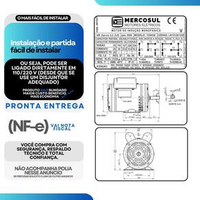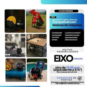 1. Esse motor é bivolt Como faço a ligação correta Sim, o motor é monofásico bivolt, operando em redes de 110-127V ou 220-254V. A ligação correta depende da tensão da rede e deve ser feita conforme o diagrama que acompanha o produto. 2. O motor já vem com polia e capacitor O motor acompanha o capacitor de partida. A polia não está inclusa na versão padrão e deve ser adquirida separadamente, salvo em kits específicos que já incluem a polia. 3. Qual o diâmetro do eixo e o tamanho da chaveta O eixo possui diâmetro de 19,05 mm 3/4 e a chaveta tem 4,76 mm 3/16 , medidas padrão para a maioria das aplicações industriais. 4. Esse motor é compatível com compressores de ar Sim, ele é ideal para compressores de até 15 pés/min e tanques entre 150 e 200 litros, incluindo modelos de 2 estágios. Oferece torque suficiente para aplicações industriais. 5. Pode ser em serras circulares ou policorte Sim, o motor é indicado para serras de bancada, esquadrejadeiras e máquinas de corte. Sua alta rotação e potência garantem desempenho estável para cortes em madeira ou metal. 6. Serve para bombas dágua, lavadoras ou forrageiras Sim, o motor pode ser em bombas hidráulicas, lavadoras , moto-esmeris, forrageiras e outros equipamentos agrícolas e industriais. 7. Qual é o sentido de rotação do motor O motor permite rotação horária e anti-horária. A inversão do sentido pode ser feita na instalação, conforme orientações do diagrama de ligação. 8. É necessário usar chave de partida Não. O motor é de partida direta e já acompanha o capacitor. Pode ser ligado diretamente à rede elétrica, com proteção adequada no disjuntor. grau de proteção: IP21; - Carcaça: 56 NEMA MG1; - Tensão: 110-127/220-254 V; - Frequência: 60 Hz; - Classe de isolação: F 155 C ; - Diâmetro do Eixo: 19,05mm ou 3/4 de polegada; - Tamanho da chaveta do eixo: 4,76mm ou 3/16 de polegada; - Fabricante: Mercosul Motores; -tecnologia Eberle. Marca: Não Informado