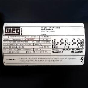 Motor Weg Para Bomba De Piscina 1/4Cv 0,25Cv 127/220V Monofásico 2 Polos Jet Pump Motor monofásico weg tipo jet pump para bombas de piscinas de 1/4cv 0,25cv 110/220v 2 polos Furação padronizada para atender todas as marcas de bombas de piscina 1/4cv 0,25cv jacuzzi, mark, pentair, dancor, darka e outras , desde que tenham as furações compatíveis com a do desenho técnico do motor. sempre verifique o desenho técnico disponível na última foto desse anúncio para conferir as medidas e dimensões do motor e se certificar da compatibilidade Projetados de forma robusta e compacta, os motores da linha jet pump são ideais para as aplicações de bomba centrífuga e filtro de piscina.Com baixo nível de ruído e baixa elevação de temperatura dt , são equipamentos de acordo com as normas vigentes, ou seja, são totalmente intercambiáveis com motores já instalados. // aplicações //Sistema de bombeamento de água por jet pump, bombas comerciais e industriais, bombas residenciais e bombas centrífugas. // especificações técnicas //- carcaça: w48j confira o desenho técnico do produto - potencia: 0,25cv 1/4cv - frequência: 50/60hz- número de polos: 2- tensão nominal: 110/220v- grau de proteção: ip21- rotação síncrona: 3600rpm- rotação nominal: 3460rpm- fixação: com pés- flange: c superior- forma construtiva: f-3/b34t- corrente nominal: 3.60/1.80a- corrente de partida: 11.9/5.94a- corrente a vazio: 2.00/1.00a- sentido de rotação: anti-horário olhando a ponta de eixo dianteira do motor - diâmetro do eixo: 15,875 h8 // atenção //Motor elétrico compatível com frentes pré-filtro não incluso :- igui- jacuzzi- cmb- dancor- nautilus e outras sempre verifique o desenho técnico disponível na última foto desse anúncio para conferir as medidas e dimensões do motor e se certificar da compatibilidade