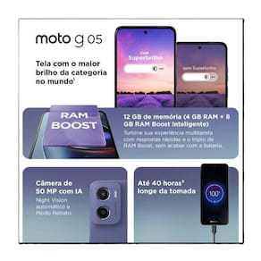 Atenção aos seguintes detalhes - Antes de utilizar o aparelho leia o manual de instruções. - Não submergir o cabo, plugue ou o aparelho em água. - O uso do produto diferente do descrito no manual de instruções acarreta na perca da . Celular Motorola G05 128GB de Memória 4GB Ram Violeta Tela 6.7'' Bateria 5200 mAh Conheça o Motorola Moto G05, o smartphone perfeito para quem precisa de uma bateria de longa duração, desempenho ágil e um design elegante. Com sua tela imersiva de 6,7 polegadas e armazenamento generoso, ele é a escolha certa para quem procura um aparelho que acompanha seu ritmo, seja no trabalho ou no lazer. Benefícios - Armazenamento Amplo de 128GB - Desempenho Ágil com 4GB de RAM + 8GB RAM Boost - Tela de 6,7 FHD+ 720 x 1612 - Câmera com IA e Night Vision Automático - Bateria de 5200mAh: Energia Que Dura o Dia Todo - Design Moderno - Segurança e Praticidade com Android 15 FICHA TÉCNICA : - Marca: Motorola - Modelo: G05 - Cor: Violeta - Memória RAM: 4 GB - Armazenamento Total: 128 GB - Tela de 6,7 FHD+ 1080 x 2400 IPS 90 Hz - Bateria: 5200 mAh - Desbloqueio Facial: Sim - Impressão Digital lateral: Sim - Peso: 188,8 g - Dimensões AxLxP :16,6 cm x 7,5 cm x 1 cm - Código Anatél: 08268-24-00330 Itens inclusos 01 Telefone 01 Manual 01 Cabo USB-A / USB-C 01 Carregador de parede 01 Ferramenta de remoção do chip pelo fabricante: 12 meses Não perca tempo limitado - Garanta o seu Moto G05 agora mesmo antes que acabe. Homologação Anatel: 166292013501