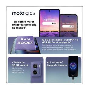 Atenção aos seguintes detalhes - Antes de utilizar o aparelho leia o manual de instruções. - Não submergir o cabo, plugue ou o aparelho em água. - O uso do produto diferente do descrito no manual de instruções acarreta na perca da . Celular Motorola G05 128GB de Memória 4GB Ram Violeta Tela 6.7'' Bateria 5200 mAh Conheça o Motorola Moto G05, o smartphone perfeito para quem precisa de uma bateria de longa duração, desempenho ágil e um design elegante. Com sua tela imersiva de 6,7 polegadas e armazenamento generoso, ele é a escolha certa para quem procura um aparelho que acompanha seu ritmo, seja no trabalho ou no lazer. Benefícios - Armazenamento Amplo de 128GB - Desempenho Ágil com 4GB de RAM + 8GB RAM Boost - Tela de 6,7 FHD+ 720 x 1612 - Câmera com IA e Night Vision Automático - Bateria de 5200mAh: Energia Que Dura o Dia Todo - Design Moderno - Segurança e Praticidade com Android 15 FICHA TÉCNICA : - Marca: Motorola - Modelo: G05 - Cor: Violeta - Memória RAM: 4 GB - Armazenamento Total: 128 GB - Tela de 6,7 FHD+ 1080 x 2400 IPS 90 Hz - Bateria: 5200 mAh - Desbloqueio Facial: Sim - Impressão Digital lateral: Sim - Peso: 188,8 g - Dimensões AxLxP :16,6 cm x 7,5 cm x 1 cm - Código Anatél: 08268-24-00330 Itens inclusos 01 Telefone 01 Manual 01 Cabo USB-A / USB-C 01 Carregador de parede 01 Ferramenta de remoção do chip pelo fabricante: 12 meses Não perca tempo limitado - Garanta o seu Moto G05 agora mesmo antes que acabe. Homologação Anatel: 166292013501 Marca: Não Informado