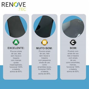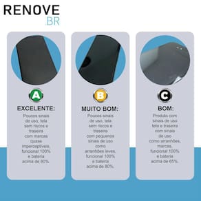 MUITO BOM: Poucos sinais de uso, tela sem riscos e traseira com pequenos sinais de uso como arranhões leves, funcional 100% e bateria acima de 80%.