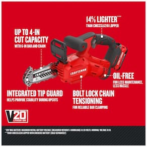 A motosserra de poda V20 é uma excelente opção para quem busca praticidade e eficiência. Equipada com uma bateria de 2,0 Ah, ela tem potência de corte ideal para realizar até 85 cortes por carga. Com barra e corrente de 6 pol, a capacidade de corte é de até 4 pol, o que garante um trabalho rápido e eficiente. Além disso, ela é 50 mais compacta e 14 mais leve do que o modelo CMCCSL621B, o que proporciona facilidade de uso e manobrabilidade. A proteção de ponta integrada é um ótimo recurso e foi projetada para ajudar a fornecer controle sobre cortes superiores. A plataforma da bateria V20 é compatível com equipamentos para atividades ao ar livre e ferramentas elétricas CRAFTSMAN V20, permitindo que você encontre a linha completa de ferramentas e equipamentos essenciais para atividades ao ar livre para um trabalho que o deixará orgulhoso. A motosserra também conta com tensionamento da corrente com trava de parafuso, fixação confiável e bainha de armazenamento com suporte de chave integrado para fácil remoção da bainha. Para maior comodidade, ela é compatível com o sistema de organização de parede VERSATRACK, permitindo que você pendure esta ferramenta diretamente no sistema de organização de parede VERSATRACK vendido separadamente . Com a motosserra V20, você terá uma ferramenta prática, eficiente e confiável para suas atividades ao ar livre.
