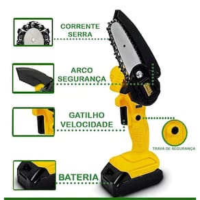 Bateria: 21V 2000mAhSabre: aproximadamente 10cmCapacidade de corte: até 150mmAutonomia: média de 2 horas por carga completaDesign: Ergonômico, leve e portátilAplicações: Corte de madeira, poda de galhos e jardinagemMarca: SnelModelo: SN07Cor: Amarelo