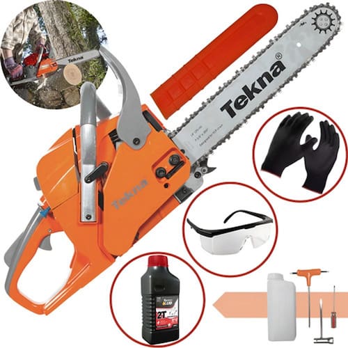 A Motosserra Tekna CS45EX une resistência e durabilidade, equipada com peças de alta qualidade e motor de 44,3 cilindradas é capaz de realizar cortes precisos sem exigir grandes esforços. Acompanha corrente Oregon e Sabre Tekna.Com Sabre TeknaCorrente OregonFreio de SegurançaSistema Anti-vibratórioInformações AdicionaisEquipada com motor a gasolina 2 tempos, de alto desempenho e rendimento, a motosserra CS45EX realiza partidas fáceis. Seu sistema antivibratório e o freio de segurança, geram estabilidade à operação, tornando-a mais confortável e segura. Possui peças de alta qualidade, proporcionando baixa manutenção e garantindo a vida útil do equipamento. Acompanha kit de ferramentas.Cilindrada 44,3 ccPotência máxima de 2,8 HPSabre Tekna de 14” SNCorrente Oregon Passo/calibre 3/8” x 0,050” 91PRotação Máxima de 13500 rpm. *EXTRAS! Neste Kit Acompanha: 1 Oleo Lubrificante Toyama 2T de 500ml + 1 Óculos de Proteção Incolor com Regulagem, Anti Risco e Anti Embaçante + 1 Par de Luvas de Proteção Tricotada com Revestimento Antideslizante.
