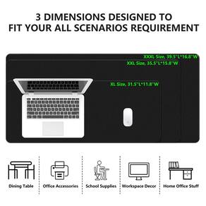 ?Tamanho estendido do mouse pad?Nosso tapete de mesa para mesa tem 3 tamanhos. Tamanho L - 31,5" L* 11,8" W (80 cm* 30 cm), XL-35,5 “L* 15,8" W (90 cm* 40 cm), tamanho XXL - 39,5 “L* 16,8" W (100 cm* 43 cm). Este mouse pad de mesa completo mede 35,5 “L* 15,8" W com 3 mm de espessura. Grande o suficiente para caber seu teclado, mouse, laptop e outros itens de tamanho normal na mesa, oferecendo mais espaço para jogos profissionais ou trabalho de escritório. ?Design de superfície especial?Nosso grande mouse pad para jogos apresenta bordas costuradas duráveis para evitar que se desfie e desgome. Também melhora a estética e a vida útil do mouse pad de mesa. Quando o mousepad para jogos ficar sujo ou com respingos de líquido na superfície do revestimento, basta limpá-lo com um pedaço de pano úmido e pronto. ?Base de borracha antiderrapante?Projetado com borracha de textura densa, o mouse pad agarra sua mesa com firmeza, evita movimentos aleatórios e fornece operação estável para seu mouse e teclado. Flexível o suficiente para ser enrolado para facilitar o transporte, para que você possa trabalhar ou jogar onde quiser. ?Lavável, dobrável e portátil?Fácil de limpar. Se você derramar acidentalmente bebidas ou outros alimentos sobre o mouse pad, basta limpá-lo com um pano de limpeza. O design leve e durável resiste a anos de uso e é fácil de transportar. ?Ótima opção de presente?Um ótimo organizador de mesa para manter sua mesa limpa e também uma linda decoração de mesa, presentes ideais para amigos, colegas, familiares ou colegas de classe.