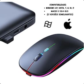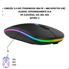 Diga adeus às pilhas descartáveis e ganhe praticidade no dia a dia. Este mouse sem fio une design moderno com luzes RGB discretas, clique silencioso para ambientes compartilhados e bateria interna recarregável via USB — tudo para uma experiência confortável, estável e sem interrupções.