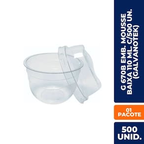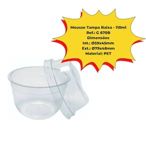 ESPECIFICAÇÕES: Modelo: G-670B Mousse Baixa Capacidade: 110 ml Quantidade: 500 unidades Material: PET cristal rígido, atóxico e reciclável Formato: Baixo e largo, com tampa articulada Tampa: Encaixe seguro, vedação sem vazamentos Uso Indicado: Mousses, cremes, gelatinas, açaí, petit fours